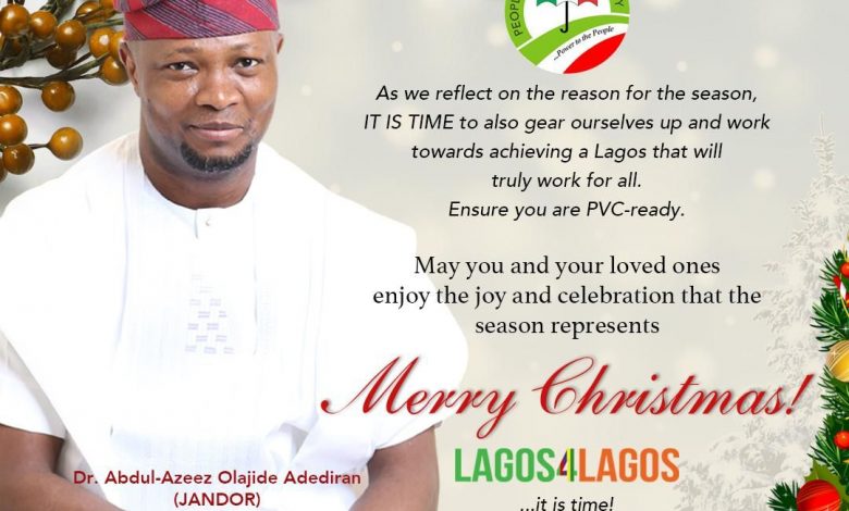 Lead Visioner, Lagos4Lagos Dr Abdul-Azeez Olajide Adediran(Jandor) has felicitated with Lagosians, particularly the Christian faithfuls, on the Christmas and New Year festivities.