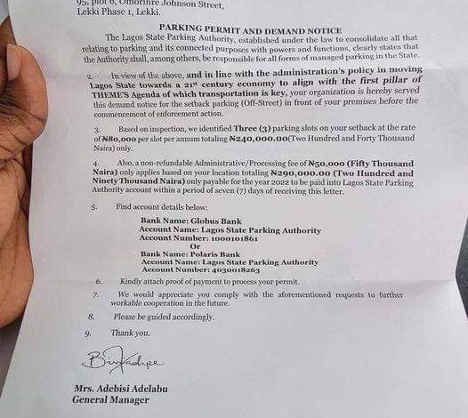 “Also, a non-refundable Administrative/Processing fee of N50,000 (Fifty Thousand Naira) only applies based on your location totalling N290,000.00 (Two Hundred and Ninety Thousand Naira) only payable for the year 2022 to be paid into Lagos State Parking Authority account within a period of seven (7) days of receiving this letter.”