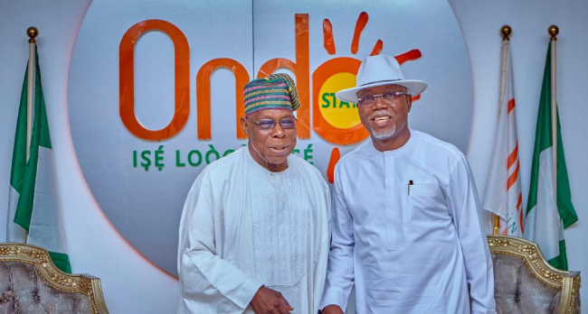 Former President Olusegun Obasanjo on Monday paid a courtesy visit to the Governor of Ondo State, Lucky Aiyedatiwa at the government house in Akure ahead of the governorship elections to be held on Saturday, 16th November.
