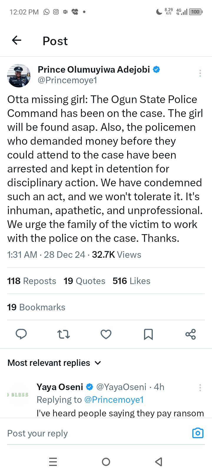 The post read: “Otta missing girl: The policemen who demanded money before they could attend to the case have been arrested and are now in detention for disciplinary action.