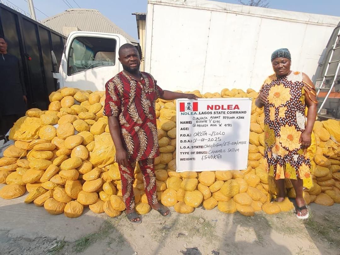 “The lid was however blown off her invincibility on Wednesday 1st January 2025 when NDLEA operatives acting on intelligence intercepted a white Izuzu truck carrying 44 jumbo sacks containing 1,540 kilograms of imported cannabis and driven by one of her staff, 41-year-old Abideen Adio. Thereafter, the operatives stormed her hideout at 33 Adebayo Oyewole Street, off Ago Palace way, Okota, where they arrested her.