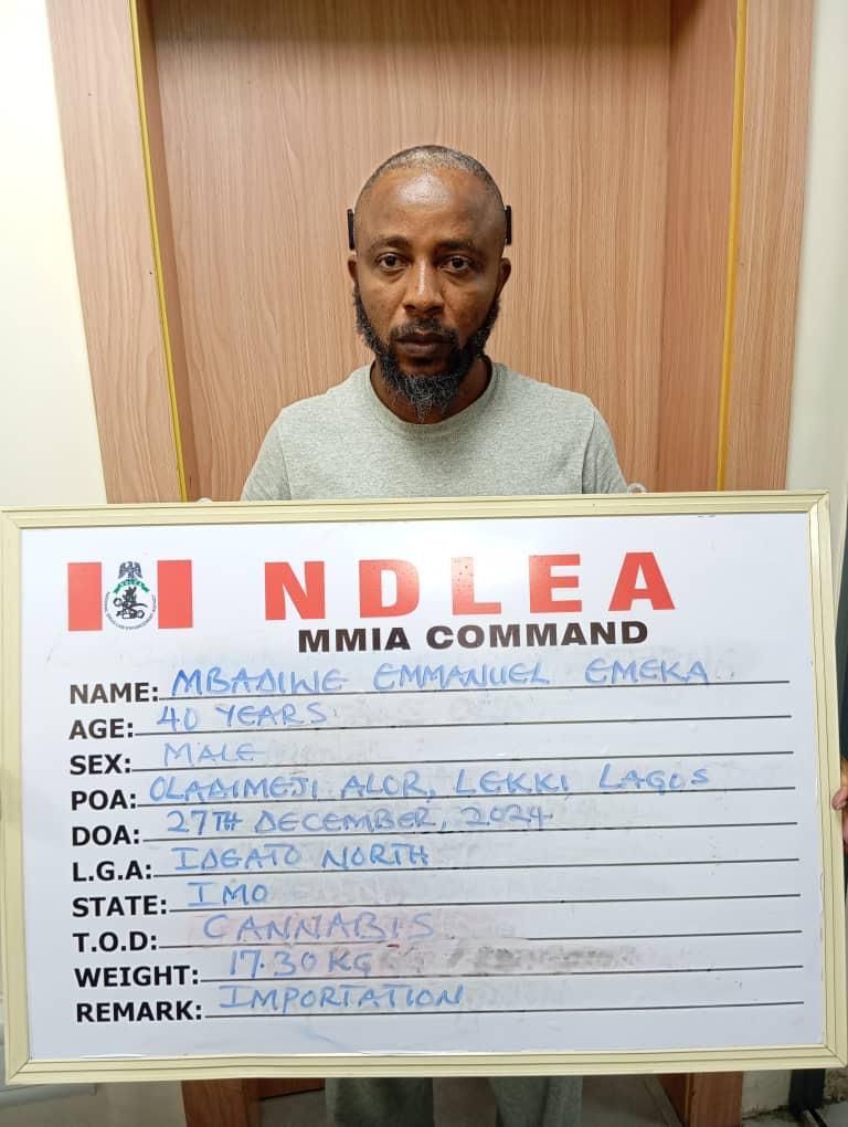 In another major operation, NDLEA said its officers on Friday 27th December 2024 arrested a US-trained Hollywood and Nollywood filmmaker, Emeka Emmanuel Mbadiwe, who is also a motivational speaker at his Lekki Hotel room following the arrest of his partner, Uzoekwe Ugochukwu James, earlier same day at a warehouse in Ajao estate Ikeja, where he was allegedly sent by Mbadiwe to collect a shipment of 33 parcels of Loud, a strong strain of cannabis weighing 17.30 kilograms, which arrived the Import shed of the Murtala Muhammed International Airport, MMIA Ikeja on 24th December 2024 from the United States on a Delta Airline flight, concealed in large wooden boxes.