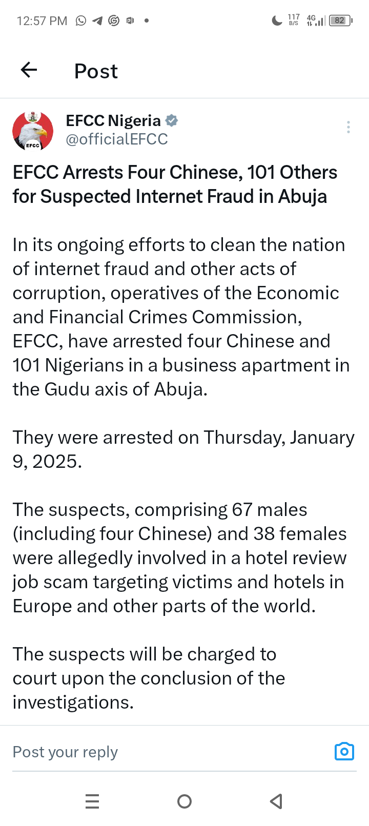 In its ongoing efforts to clean the nation of internet fraud and other acts of corruption, operatives of the Economic and Financial Crimes Commission, EFCC, have arrested four Chinese and 101 Nigerians in a business apartment in the Gudu axis of Abuja.