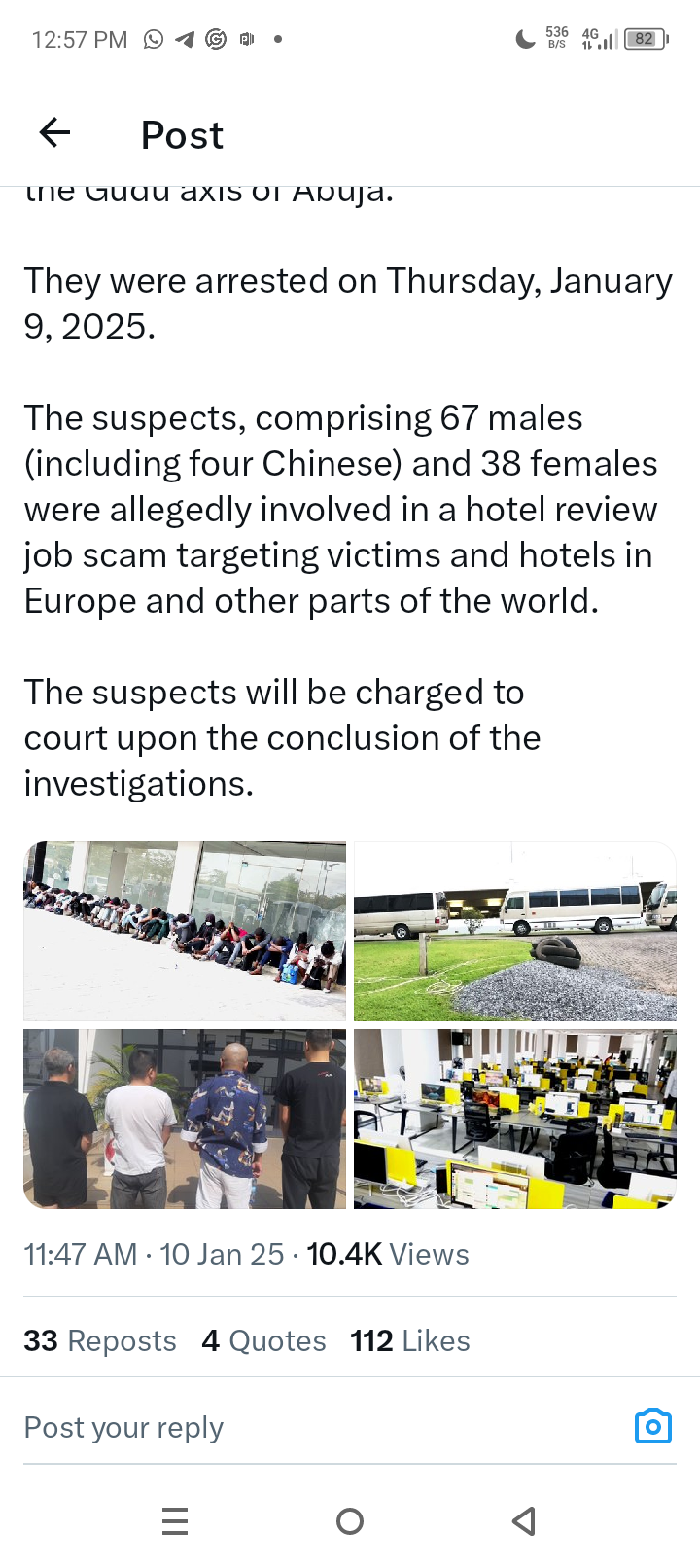 According to the Commission, the suspects, comprising 67 males (including four Chinese) and 38 females were allegedly involved in a hotel review job scam targeting victims and hotels in Europe and other parts of the world.