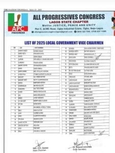 FULL LIST OF APC VICE CHAIRMANSHIP CANDIDATES – LAGOS LG ELECTION 2025