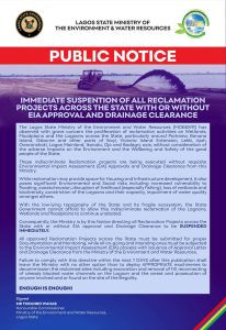 The Lagos State Government has ordered the immediate suspension of all reclamation projects across the state, with or without Environmental Impact Assessment (EIA) approval or drainage clearance. It warned that failure to comply within seven days would attract arrest and prosecution of anyone involved or found on site.