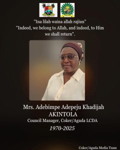 In a statement posted on the Facebook page of Coker/Aguda LCDA, the Council Chairman, Ogidan Azeez, had expressed deep sorrow over the passing of the Council Manager, describing her as “a pillar of dedication, professionalism, and humility, whose warmth and tireless commitment to service left an indelible mark on the Council and the wider community.”