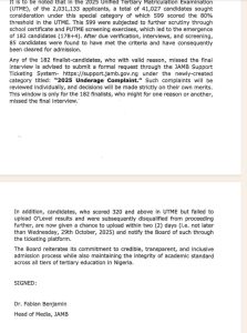 “Any of the 182 finalist-candidates who, with a valid reason, missed the final interview, is advised to submit a formal request through the JAMB Support Ticketing System https://support.jamb.gov.ng under the newly created category titled ‘2025 Underage Complaint.’ Such complaints will be reviewed individually, and decisions will be made strictly on their own merits. This window is exclusively for only the 182 finalists who might, for one reason or the other missed the final interview.”