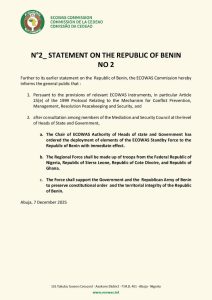 “The Chair of ECOWAS Authority of Heads of State and Government has ordered the deployment of elements of the ECOWAS Standby Force to the Republic of Benin with immediate effect.”