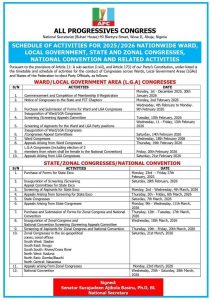 The All Progressives Congress has released a comprehensive schedule of activities for its 2025/2026 nationwide ward, local government, state and zonal congresses, culminating in the party’s national convention.
